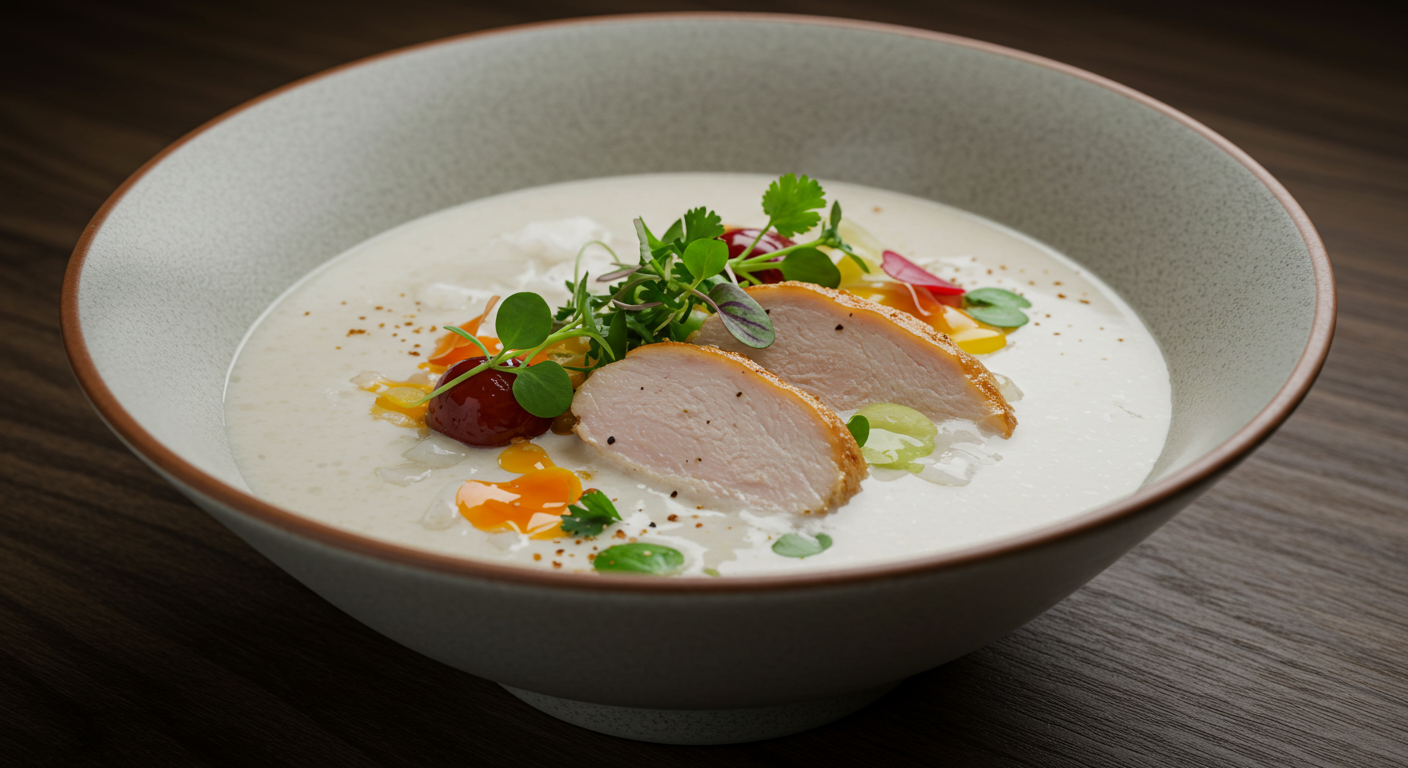 羊骨をしっかり丁寧に煮込んだ、乳白色でクリーミーなスープ。臭みは一切なく、凝縮さ れた旨味が口いっぱいに広がり、後味は驚くほどすっきりしています。トッピングは低温調 理した鶏むね肉、旬野菜、ハーブなど、繊細さと美しさを重視します。