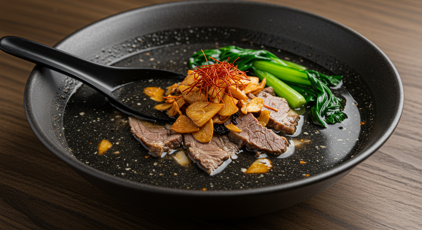 羊骨ベースのスープに、焦がしニンニクや特製香味油などを加え、香ばしさと奥深いコ ク、そしてパンチを追求した黒いスープ。重厚ながらもしつこくない絶妙なバランスで、男 性や食べ応えを求める層にも満足感を提供します。辛味の調整も可能です。