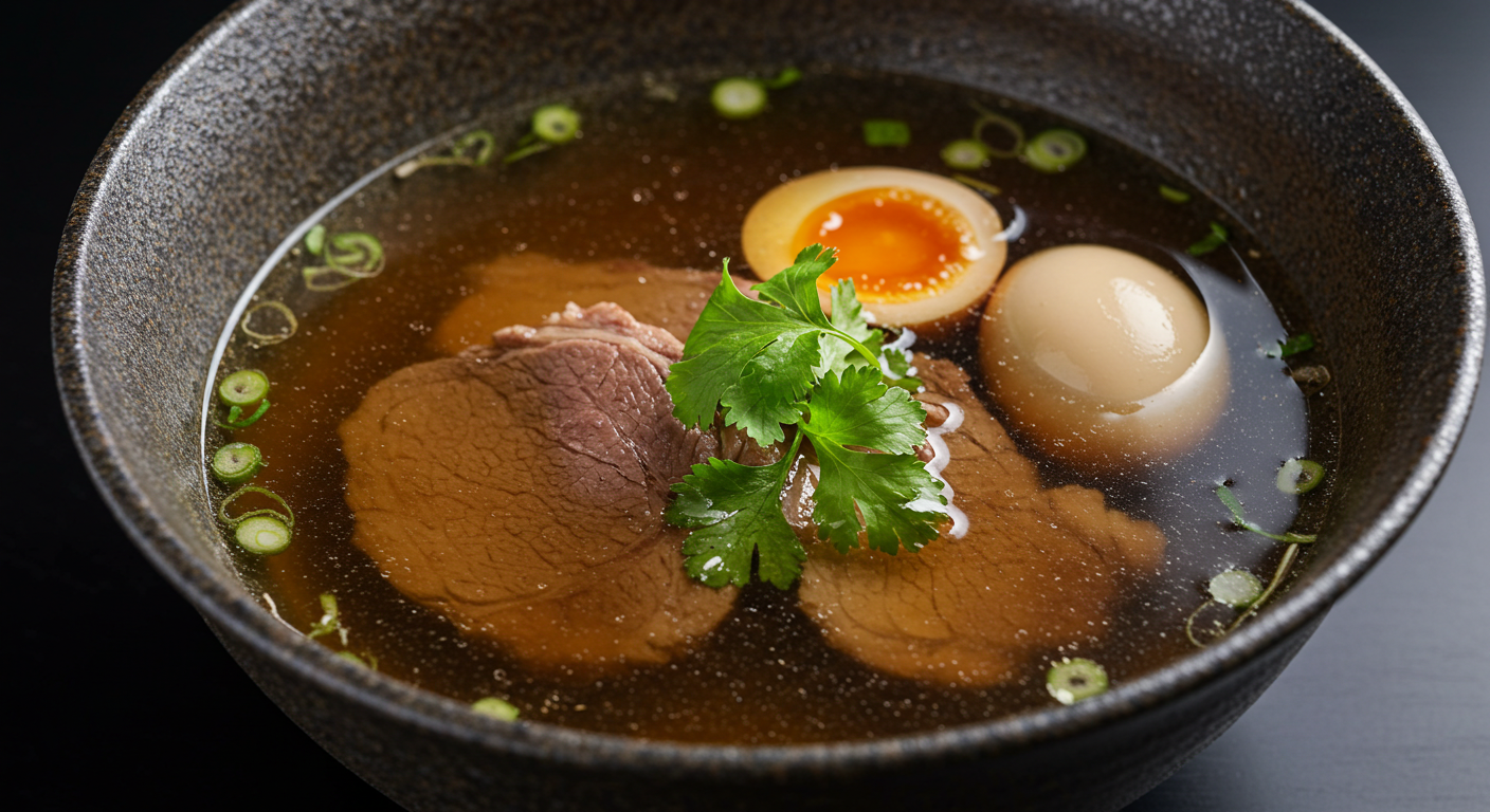 羊骨と数種類の和風出汁を合わせた、クリアながらも奥深い琥珀色のスープ。繊細な香り とコクが特徴で、柚子や三つ葉など、和のハーブがアクセント。
